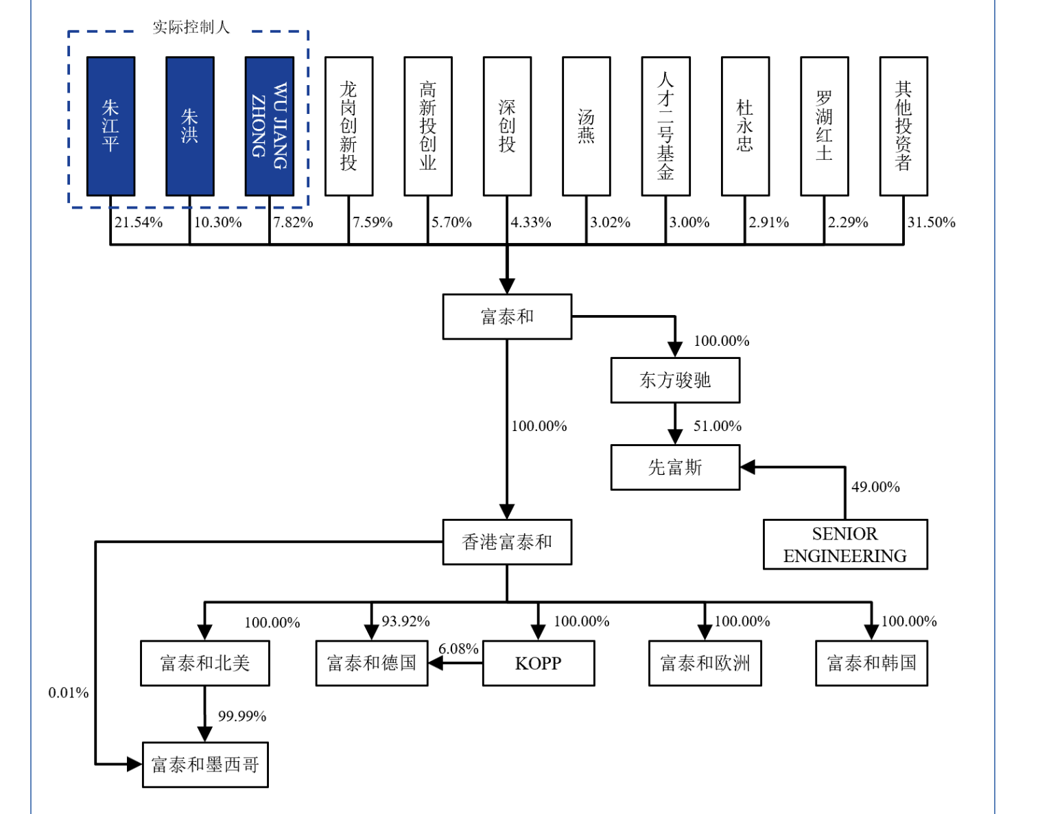 本次发行前,富泰和实际控制人朱江平、朱洪、WU JIANG ZHONG(伍江中)为兄弟关系,合计控制公司39.65%的表决权。其中,朱江平担任公司的董事长;朱洪担任公司的董事、总经理;伍江中担任公司的董事。