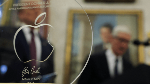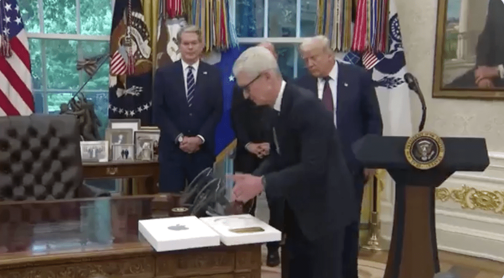 2025年8月6日,美国总统特朗普和苹果行政总裁库克(Tim Cook)在白宫椭圆形办公室宣布,苹果将向美国制造业“加码”投资1000亿美元。期间库克向特朗普送上一款由iPhone玻璃供应商康宁特制的“美国制造”纪念品——镶嵌于24K黄金底座的特制玻璃圆盘,上面刻有苹果标志、特朗普姓名、库克签名及“美国制造-2025”字样,在网民引发批评,被指讨好特朗普。