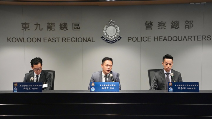 ▲东九龙总区刑事部警司温景亨(中)、东九龙总区公众活动调查组总督察陶劲笙(左)及东九龙总区公众活动调查组高级督察周嘉润(右)。