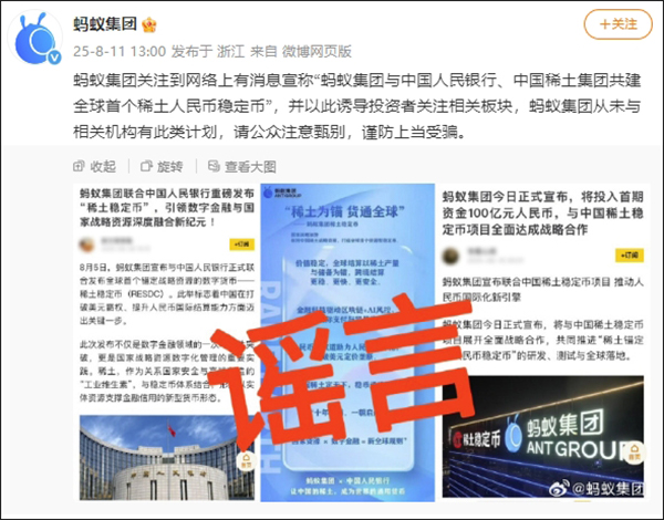 首页>财经>公司新闻 与央行、中国稀土共建全球首个稀土人民币稳定币?蚂蚁集团辟谣 发布时间:2025-08-11 13:58 微博@蚂蚁集团8月11日发布消息称,蚂蚁集团关注到网络上有消息宣称“蚂蚁集团与中国人民银行、中国稀土集团共建全球首个稀土人民币稳定币”,并以此诱导投资者关注相关板块,蚂蚁集团从未与相关机构有此类计划,请公众注意甄别,谨防上当受骗。 编辑︱胡影雅 热门文章 玉渊谭天:英伟达H20不环保不先进更不安全,消费者可选择不买 “前所未见”,华邮揭密:美关税谈判扩及国安 特朗普:街友须远离华府,立刻迁出另行安置 DeepSeek母公司曝丑闻,高层私吞近2000多万非法佣金被捕 新央企董事长登门拜访华为,敬佩任正非视野格局 官方通报查处,中科院高层腐败 百万年薪女总监出差遭性侵,设酒局老板被判4年公司赔111万 民众党维持两年条款,黄国昌明年告别“立院”:与柯文哲有约定 823罢免案倒数,杨琼璎后里造势,蓝营大咖齐聚力挺 美驻北约大使:泽连斯基可能出席普特会 专题 更多 > 中芯国际上半年营收预计超22亿美元,四季度将试产7nm工艺 太兴盈喜料多赚逾3倍,指将坚守审慎理财政策 中国移动半年多赚5%,中期息增近6% 清华女学霸创业、一年一融资,镁佳股份估值9.3亿美元冲刺港交所 应收账款走高,丰沃股份三成收入打“白条” 惠科股份IPO:获政府补助超53亿,向实控人堂弟采购超8亿 关税战|白宫:特朗普签行政命令,对华关税暂缓期再延长90日 高盛:64%关税成本由美企“买单”,消费者仅承担22% 美媒:特朗普政府通过关税施压,要求买美国军火