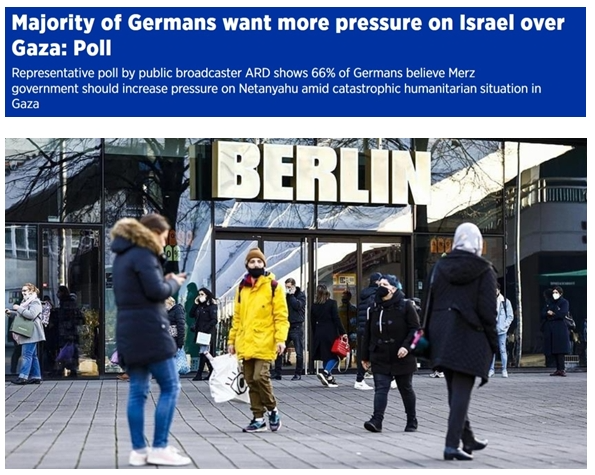 德国公共广播联盟(ARD)最新发布的民调结果显示,大多数(66%)德国受访者希望默茨政府向以色列施加更大压力,以迫使其切实应对加沙正在发生的严重人道主义危机。
