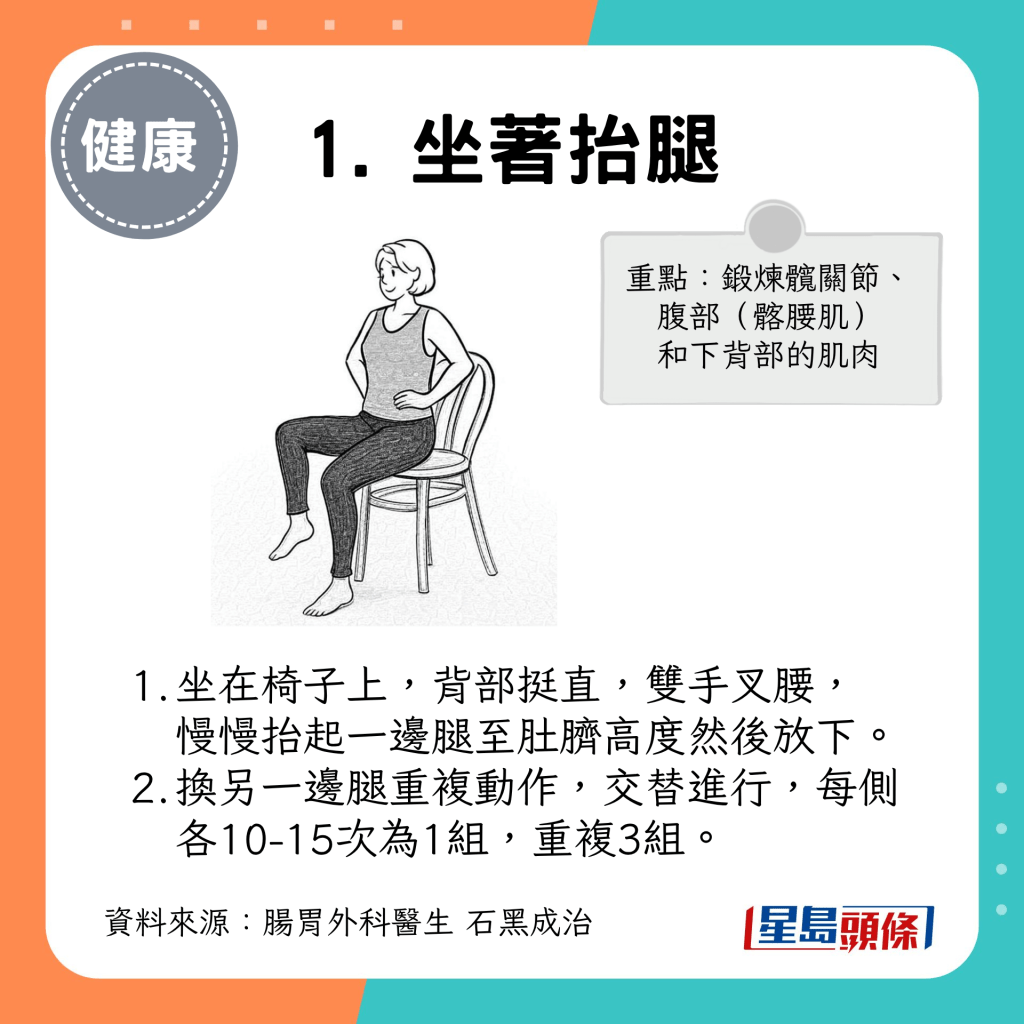 坐在椅子上,背部挺直,双手叉腰,慢慢抬起一边腿至肚脐高度然后放下。