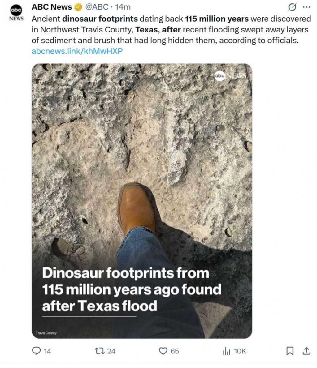 美国德州西北特拉维斯郡(Northwest Travis County)在七月初的暴洪过后,意外出土一批保存约1.10亿至1.15亿年的恐龙脚印。洪水期间,大桑迪溪(Big Sandy Creek)水位暴涨至约6公尺,冲走沉积土壤与植被,将这些隐藏数十年的化石遗迹完整暴露。专家研判,这些印迹可能来自双足肉食性恐龙高棘龙(Acrocanthosaurus),体长可达10公尺。