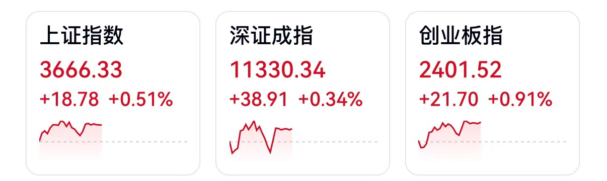截至午间收盘,沪指报3666.33点,涨0.51%;深成指报11330.34点,涨0.34%;创指报2401.52点,涨0.91%。