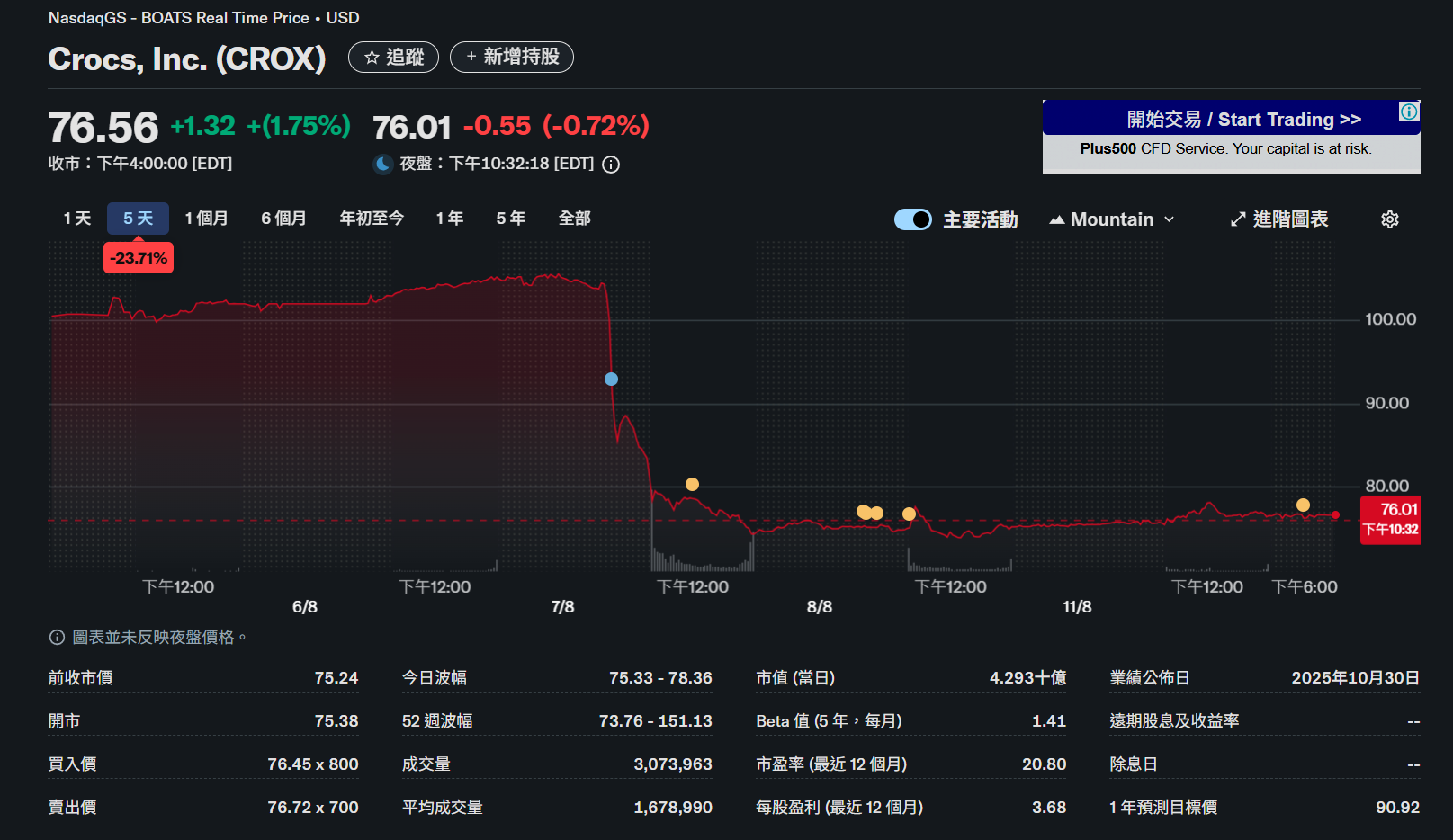 同日,Crocs还发布第三季度业绩展望,预计营收同比下降9%至11%,与此前第三季度营收会实现小幅增长的预测背道而驰。受此影响,Crocs股价在当日收盘时暴跌29.2%,报收74.39美元,触及近三年来的最低点,也是其近十四年来最大单日股价跌幅。此后2个交易日Crocs股价小幅度波动,截至8月11日收盘,报收76.55美元。