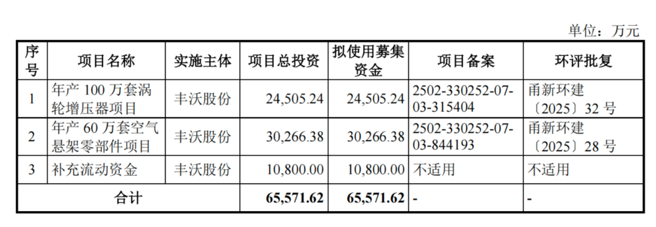 这也意味着,短期内汽车涡轮增压器依然是丰沃股份的核心业务。本次IPO,丰沃股份拟募资6.56亿元,其中2.45亿元用于年产100万套涡轮增压器项目建设,3.03亿元用于年产60万套空气悬架零部件项目。确保涡轮增压器业务的稳定增长的同时,加速新产品的推出和市场验证。