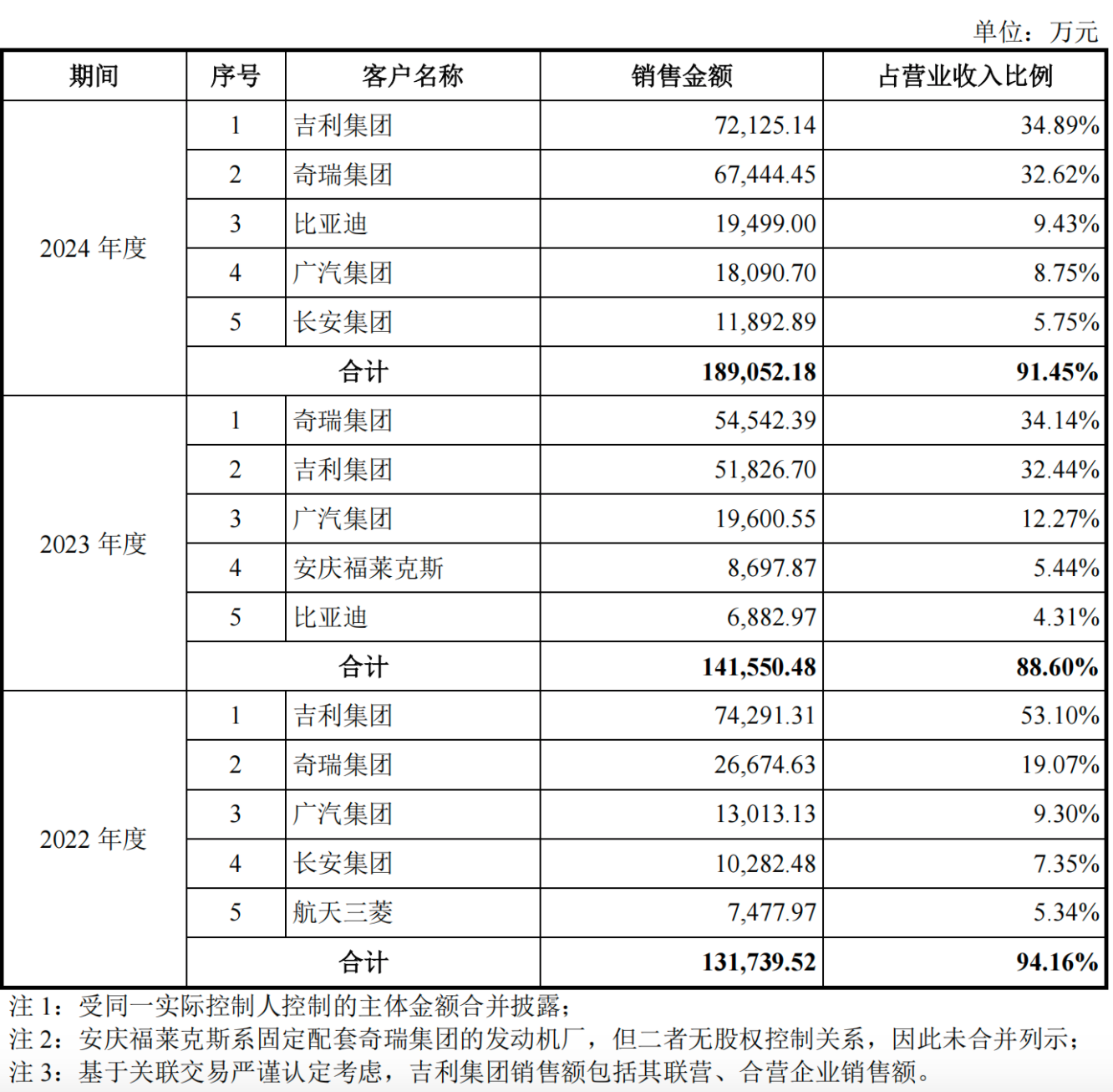 涡轮增压器产品是汽车发动机系统的重要零部件之一,2023年因吉利方部分更替车型的涡轮增压器产品受其他竞争对手低价报价策略影响减少合作供应,双方交易金额及占比有所下降,奇瑞集团超越吉利集团成为第一大客户;但随着吉利汽车2024年度整体销量提升,双方交易金额有所回升,吉利集团重回第一大客户位置。