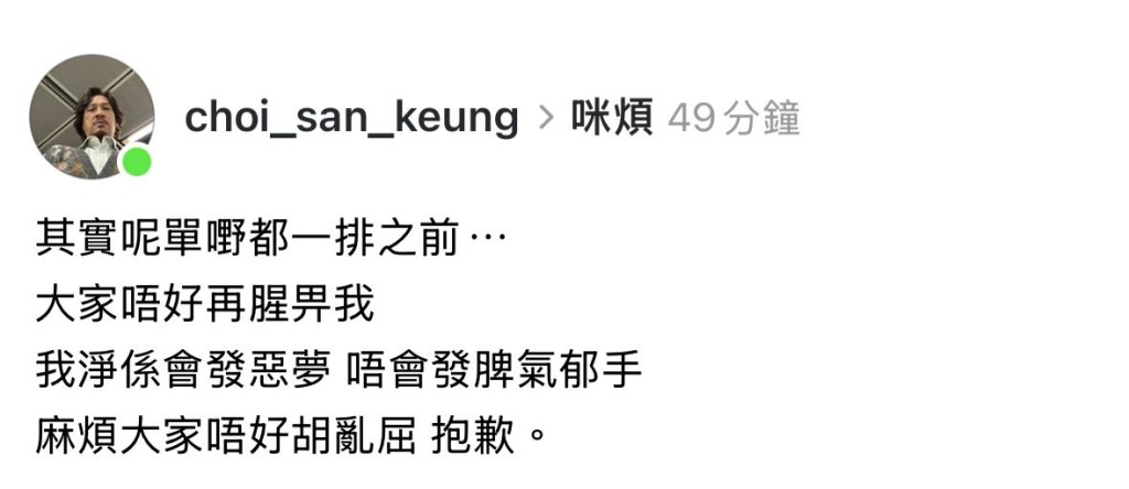 现年60岁的两届金像影帝张家辉,早前为宣传《赎梦》而多次以戏中角色“蔡辛强”一角在网上留言与网民互动。 近日网上多个社交平台疯传一段张家辉在街头与路人争执的片段,一度在网上引起热话。 而在较早前,张家辉再次化身“蔡辛强”在网上留言,就该段影片作出“回应”。