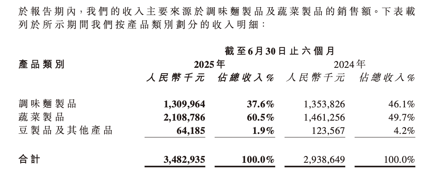 本报告期内,公司蔬菜制品所得收入由上年度同期的14.61亿元增长44.3%至21.09亿元,占总收入百分比由上年度的49.7%增至60.5%。