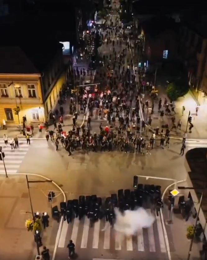 示威者在贝尔格莱德街头反政府,部份人高叫反对总统武契奇的口号。警员与上街民众爆发冲突,随后警方发射催泪弹驱散民众。