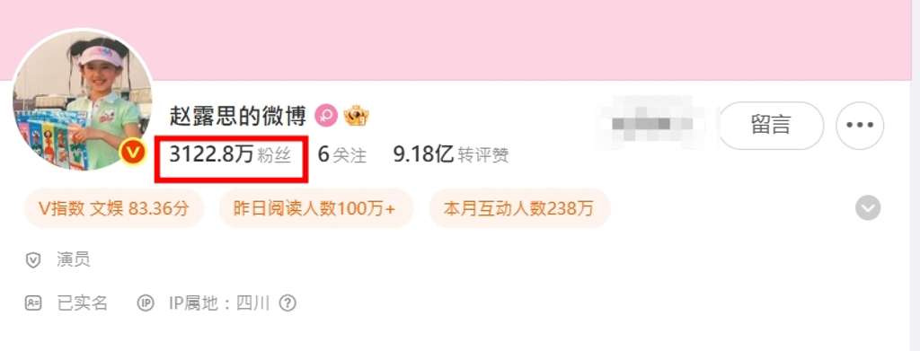 ▲赵露思微博拥有超过3000万粉丝关注。 (图/翻摄自赵露思 微博)