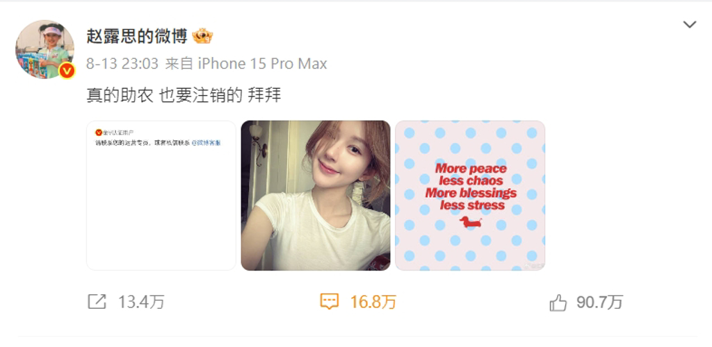赵露思微博的最后一篇贴文,写下:“真的助农,也要注销的,拜拜”,PO出三张图片:其中一张是显示微博帐号“注销中”的截图,另一张是自己身穿白T的甜美自拍, 最后一张则是一句充满寓意的字句:“More peace, less chaos. More blessings, less stress.(多一些平静,少一些混乱;多一些祝福,少一些压力)”,似乎暗示她近期的心境转折。