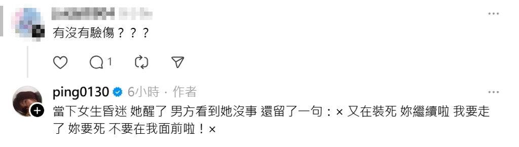 江祖平强调:“这是真实发生的,请重视。”并透露涉案男子来自电视台体系内部。 她直言对友人十分心疼,但同时也因事件牵涉到庞大的电视台资源,让她满是无力感:“我能怎么做才能帮到她?”事件曝光后,网友纷纷涌入留言区关心,甚至有人追问:“有没有去验伤?”对此,江祖平无奈回应,当时女性友人还处于昏迷状态,醒来后男子见她没事,却留下冷血的一句话:“×又在装死 你继续啦,我要走了,你要死,不要在我面前啦! ×”,这番话让许多人听了不寒而愠。