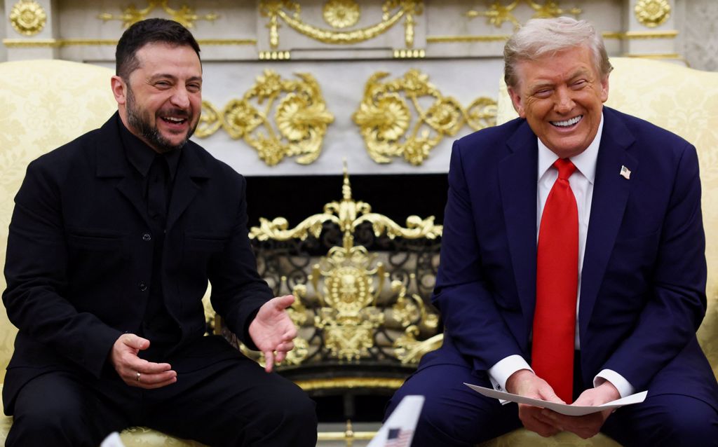 ▲乌克兰总统泽连斯基18日换上一身正式的黑色西装,在白宫椭圆形办公室会见美国总统特朗普时,双方都露出灿烂的笑容,气氛与上次会谈截然不同。(路透)