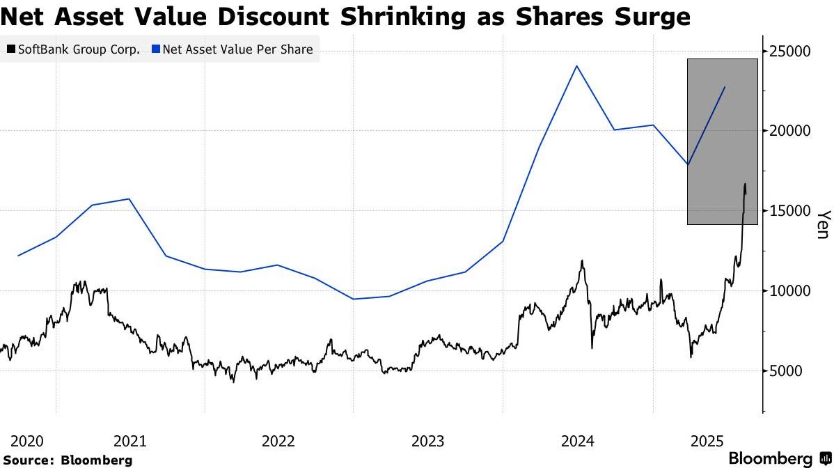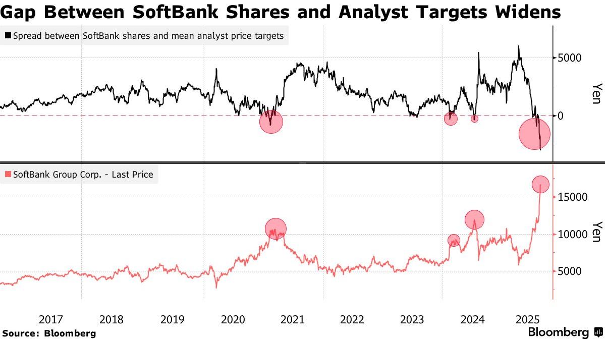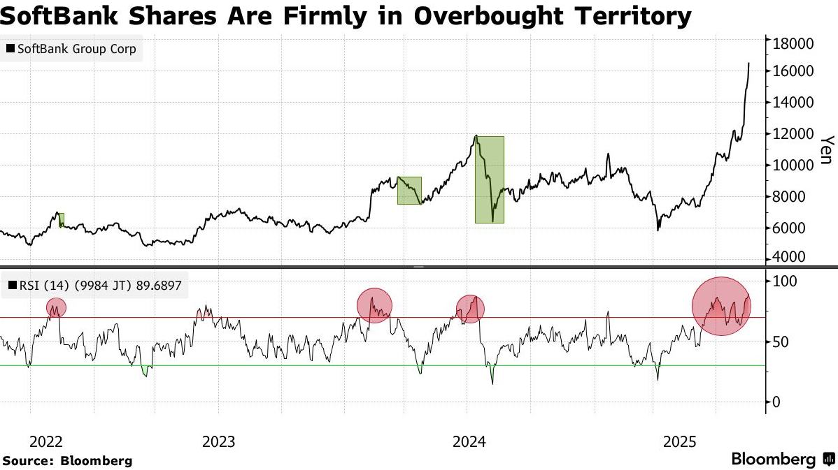 软银(SFTBY.US)股价在经历本月大幅上涨后,短期上涨空间或已受限。尽管周一股价单日飙升逾7万亿日元(约合470亿美元)并刷新历史新高,但包括Sparx资产管理公司在内的部分投资者认为,该股在四个月内135%的涨幅已过快,需警惕回调风险。