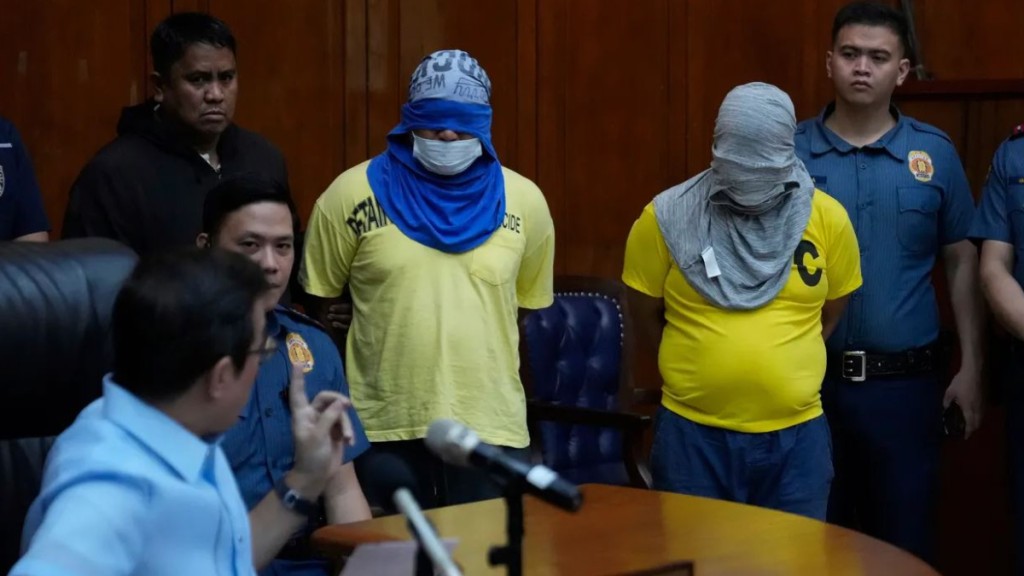 ▲菲律宾警方拘捕两名涉案疑犯。美联社