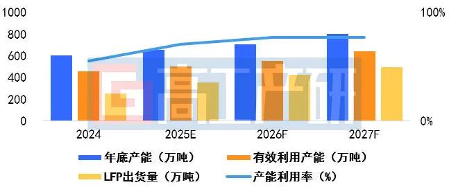 据GGII数据显示,2025H1中国磷酸铁锂正极材料出货量161万吨,同比增长68%,磷酸铁锂材料产能利用率大幅度提升,预计2025年磷酸铁锂材料出货量有望达到350万吨,有效产能利用率有望超过70%,到2027年其有效产能利用率有望超75%。