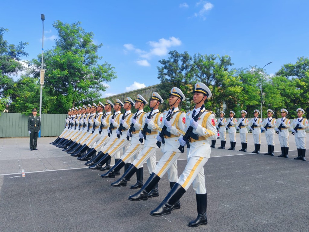 ▲三军仪仗队官兵在30摄氏度的高温下,演示训练情况。