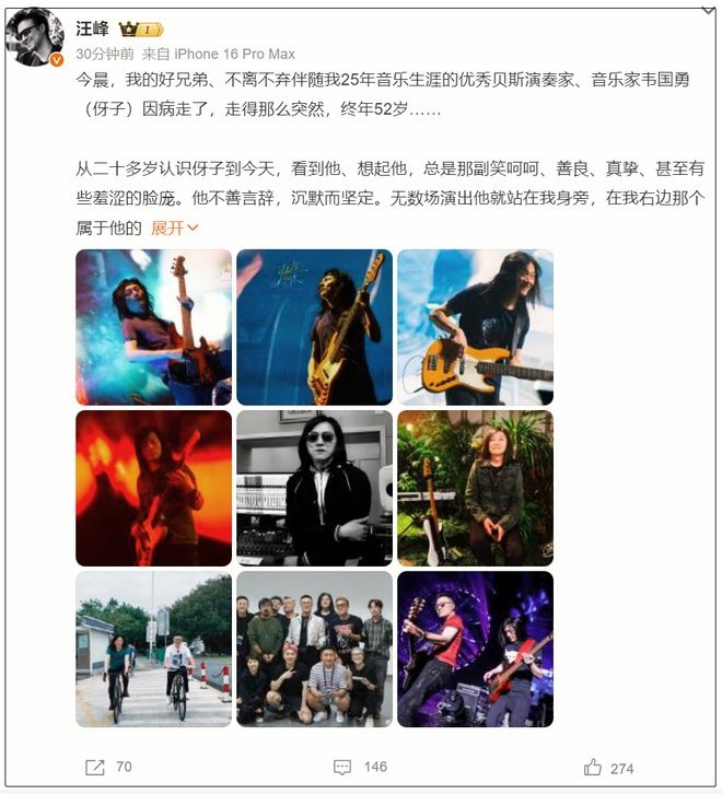 汪峰工作室之后亦有发文:“我们怀着无比沈痛的心情,与汪峰先生一同送别我们最亲密的战友、家人般的伙伴——韦国勇(伢子)先生。 25载风雨同路,舞台右侧沈静专注的身影、温暖羞涩的笑容,已成为我们共同记忆中最珍贵的定格。 愿天堂的舞台,仍有你长发飘飘、帅气笑颜,并自由地弹拨着你最心爱的贝斯......“。