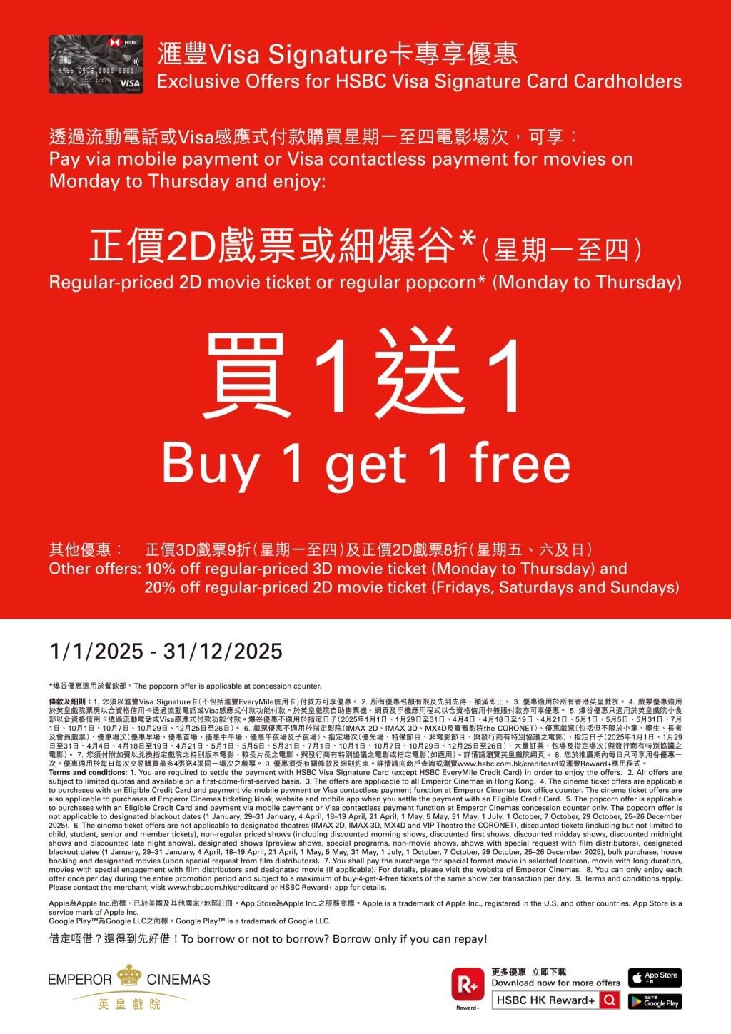 此外,即日起至12月31日凭汇丰Red信用卡登记及于MCL戏院签账,可透过汇丰Reward印花卡奖赏功能专享高达额外$360“奖赏钱”。于MCL戏院单一签账淨额满50元或以上可赚取及收集1个印花,收集每满3个印花可领取额外$30“奖赏钱”,今年内尚有7月1日至9月30日、10月1日至12月31日两个阶段可储印花,每个阶段最多可享额外$90“奖赏钱”。
