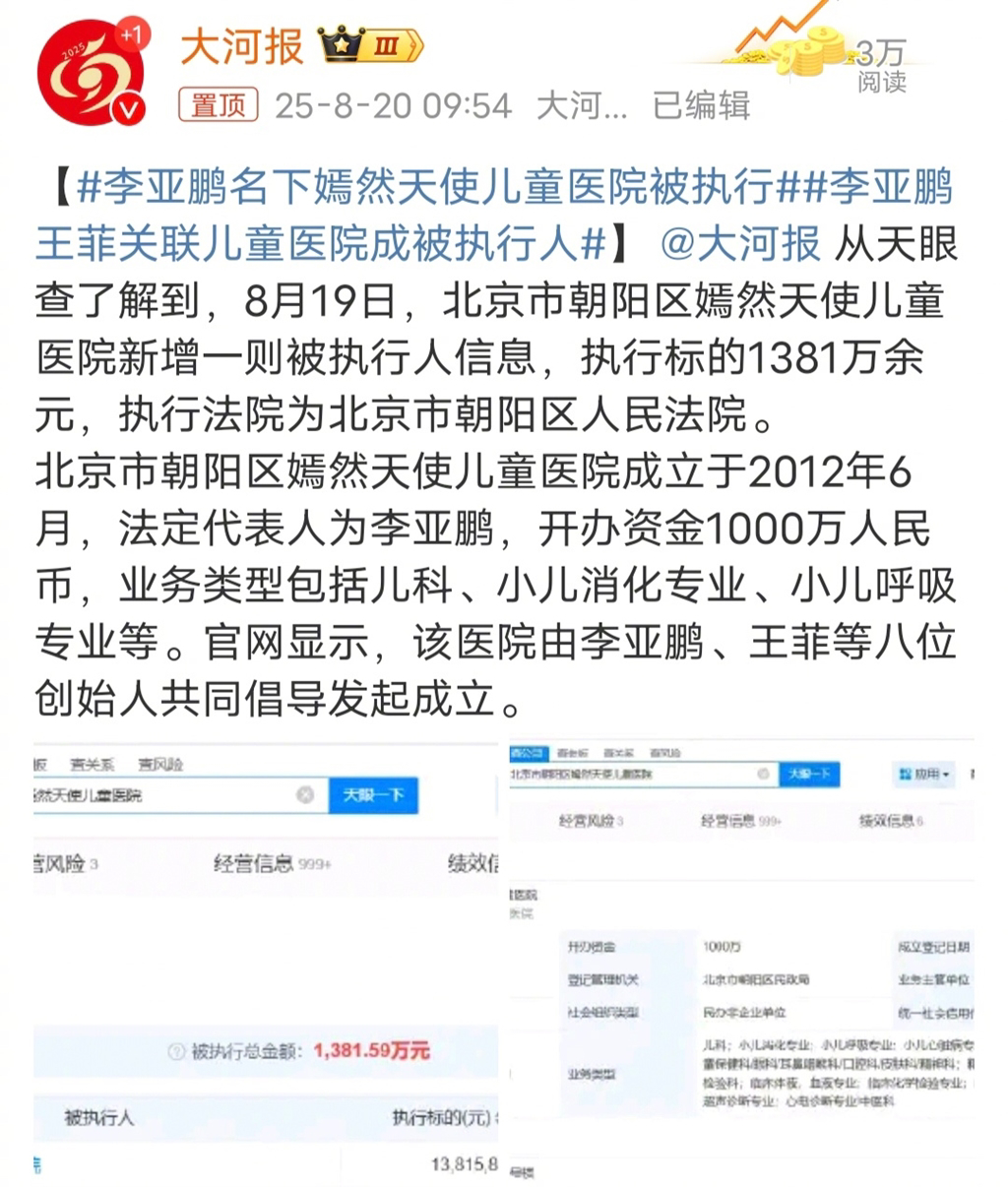 据《大河报》报导,王菲和李亚鹏等八位创始人在2012年6月在北京朝阳区成立嫣然天使儿童医院,开业资本约1000万人民币,服务项目有小儿科、小儿消化专科、小儿呼吸专科等,最近在天眼查APP中发现该医院多了一条被执行人讯息,执行标的为1381万人民币,网友见此说:“李亚鹏如果好好演戏真的不会这样”、“ 他就算乖乖躺平过日子,也不至于现在这样,生来不是做生意的料”、“他做了那么多慈善,为什么好人没好报呢?”、“还好王菲早就切割了”。