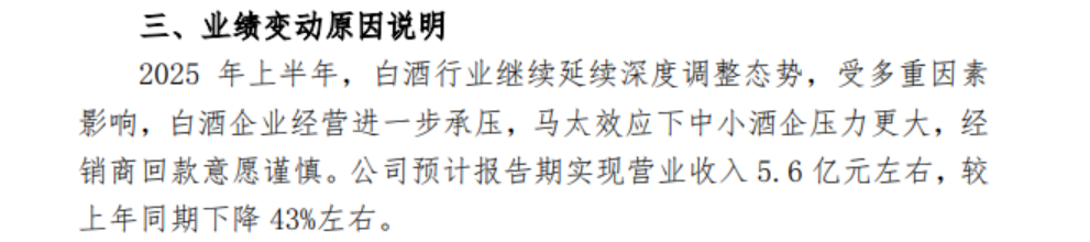 7月15日,酒鬼酒发布的业绩预告就营收和利润再次下降九成进行说明,2025 年上半年,白酒行业继续延续深度调整态势,受多重因素影响,白酒企业经营进一步承压,马太效应下中小酒企压力更大,经销商回款意愿谨慎。