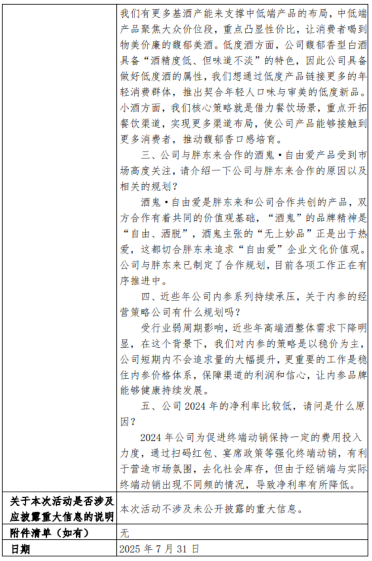 8月4日,酒鬼酒发布投资者关系管理信息公告显示,7月31日,由华西证券、嘉实基金、汇安基金等 5 人进行特定对象调研,公司董事会秘书汤振羽、证券事务代表宋家麒接待,双方围绕业绩承压情况、“二低一小”产品战略、与胖东来合作情况、内参经营策略、2024年公司净利率较低原因五个方面进行交流。