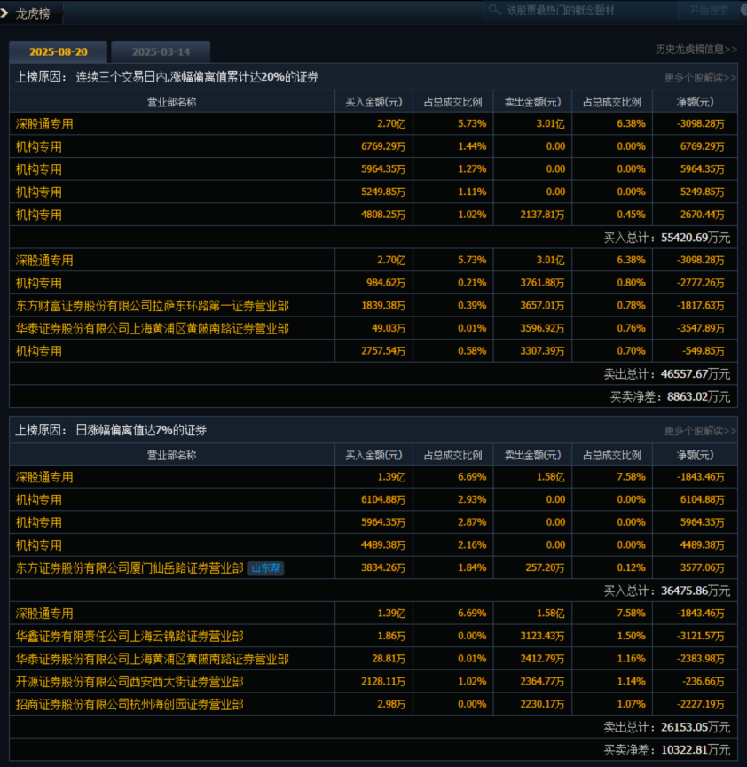 卖方则以深股通和部分券商营业部为主。其中,深股通专用席位虽成交活跃,买入1.39亿元、卖出1.58亿元,但仍呈现净卖出1843.46万元。华鑫证券上海云锦路营业部、华泰证券上海黄浦区黄陂南路营业部、招商证券杭州海创园营业部卖出超2000万元,且这些席位买入金额较低。