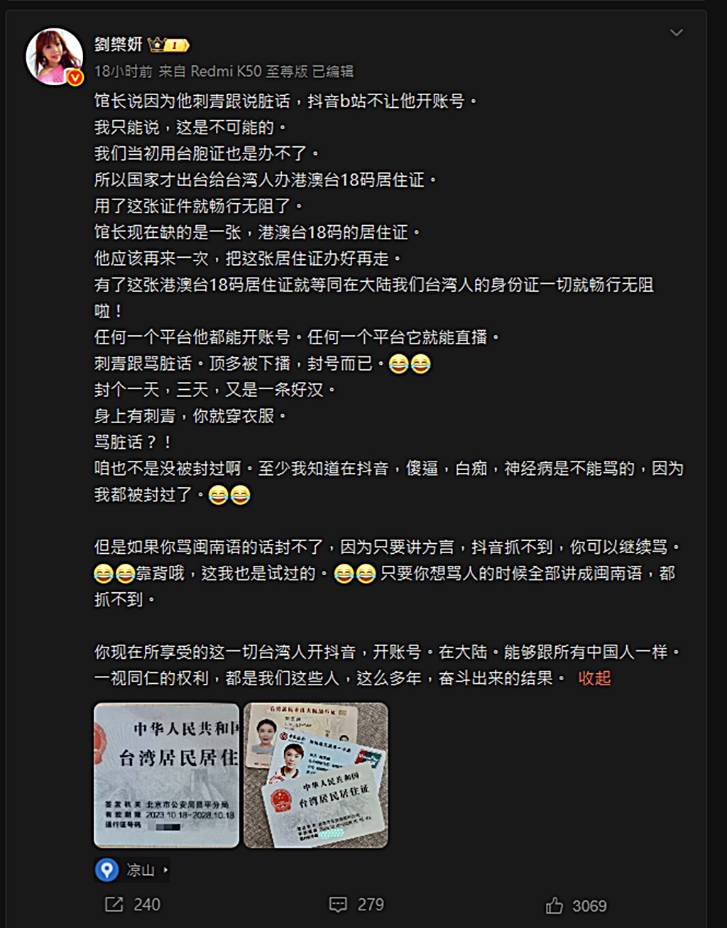 刘乐妍昨发文说,馆长抱怨自己说脏话、刺青,无法在抖音跟bilibili开帐号,刘乐妍直言不可能,解释:“我们当初用台胞证也是办不了。 所以国家才推出给台湾人办港澳台18码居住证。 用了这张证件就畅行无阻了”,并提醒他下次来要办好这一张,之后就可以畅行无阻。