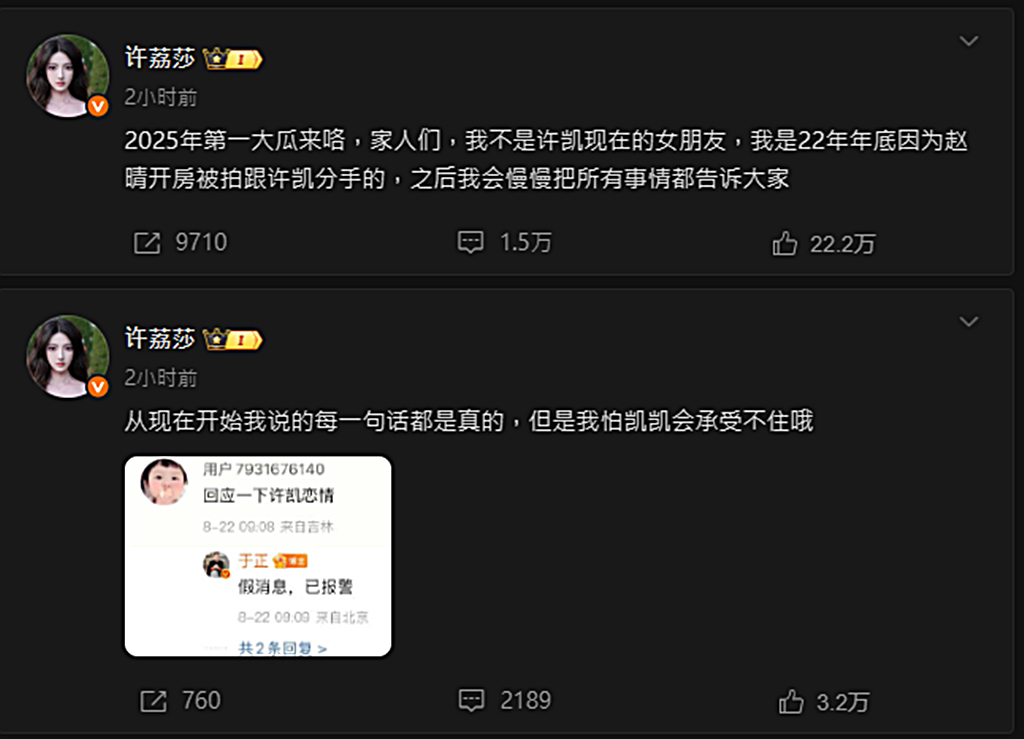 在《延禧攻略》中饰演痴恋女主角魏璎珞的“傅恒”一角的男星许凯,今(22日)被女星许荔莎点名说:“2025年第一大瓜来咯,家人们,我不是许凯现在的女朋友,我是22年年底因为赵晴开房被拍跟许凯分手的,之后我会慢慢把所有事情都告诉大家”,自曝是许凯的前女友,还爆料许凯和赵晴开房间,让许凯的经纪人于正稍早发文表示会提告。