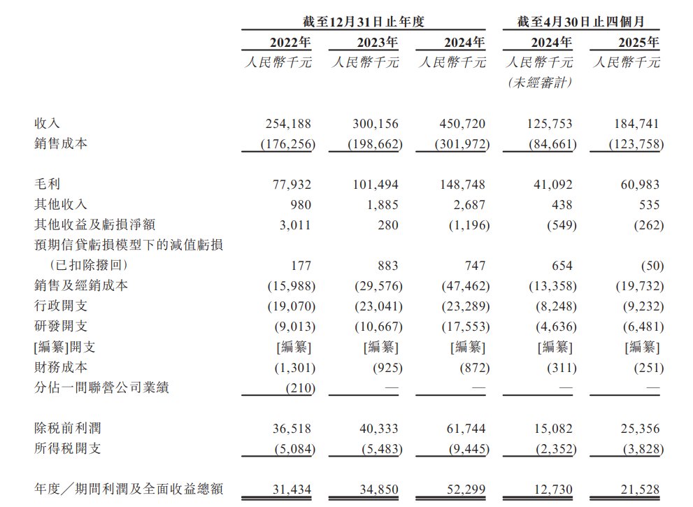 财务方面,于2022年度、2023年度、2024年度、2024年及2025年截至4月30日止四个月,大行科工实现收入分别约为2.54亿元、3亿元、4.51亿元、1.26亿元、1.85亿元人民币;同期,年度利润及全面收益总额分别为3143.4万元、3485万元、5229.9万元、1273万元、2152.8万元人民币。