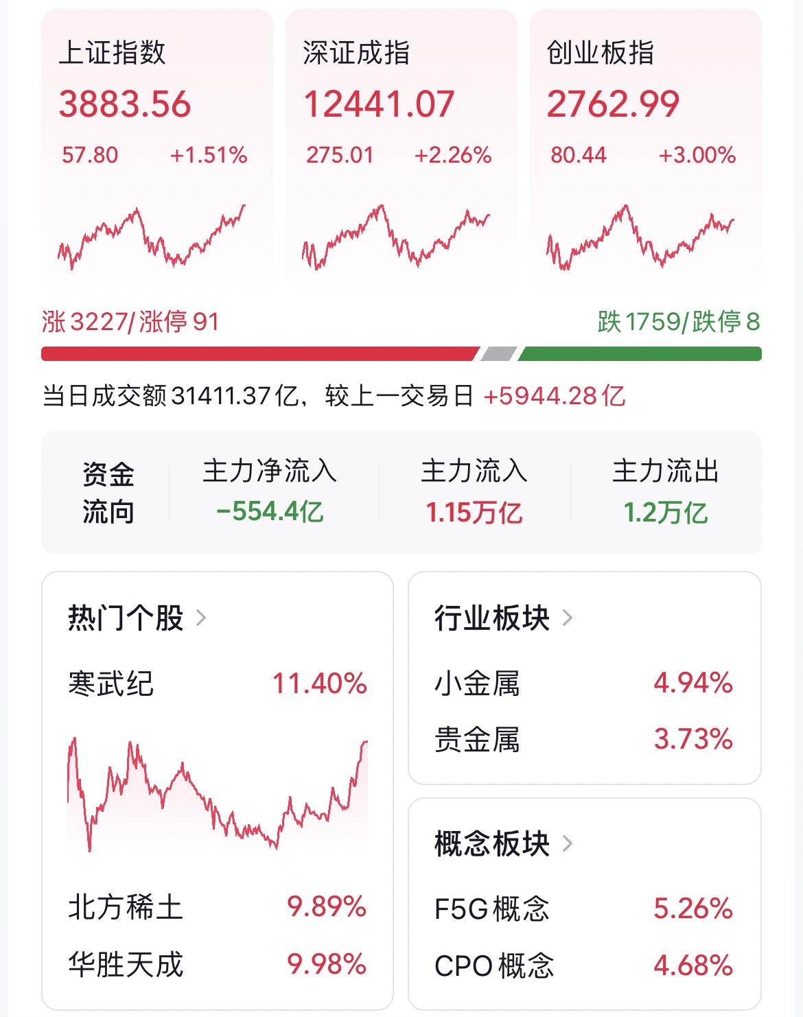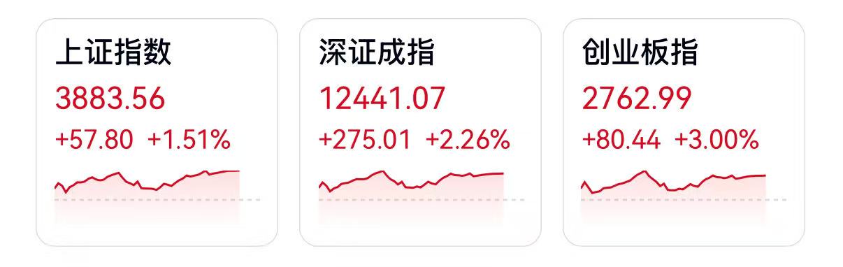 截至收盘,沪指报3883.56点,涨1.51%;深成指报12441.07点,涨2.26%;创指报2762.99点,涨3.00%。盘面上,稀土永磁、白酒板块、F5G概念涨幅居前,赛马概念、共享单车、芬太尼板块跌幅居前。
