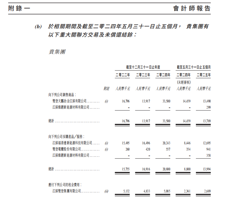 其一,关联交易信息“消失”?双登股份A股招股书明确披露,2022年与关联方泰州振杰(实控人亲戚控制企业)有1404万元的交易,但在港股招股书附录中,这笔交易记录却被删除。