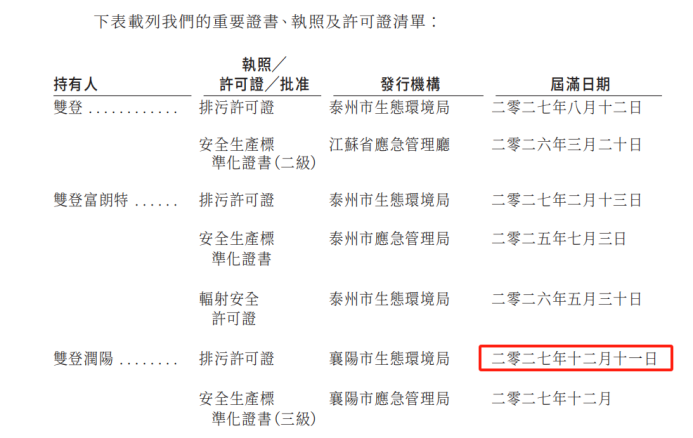 ▲双登股份港股招股书中“证书、执照与许可证”摘录