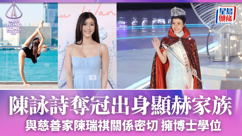 港姐2025|《2025香港小姐竞选》冠军由陈咏诗夺得! 现年26岁的陈咏诗(Stacey)是博士生,她的身高为160cm,体重为47.8公斤。 陈咏诗的兴趣及才艺是艺术体操、跳舞及表演。 而她的志向是将正能量、爱与自信带给更多人,鼓励每一个人都勇敢追梦,发挥自己的无限可能。 陈咏诗除了是不折不扣的学霸外,原来陈咏诗还是慈善家陈瑞祺的后人。