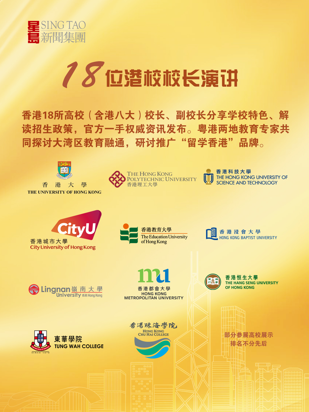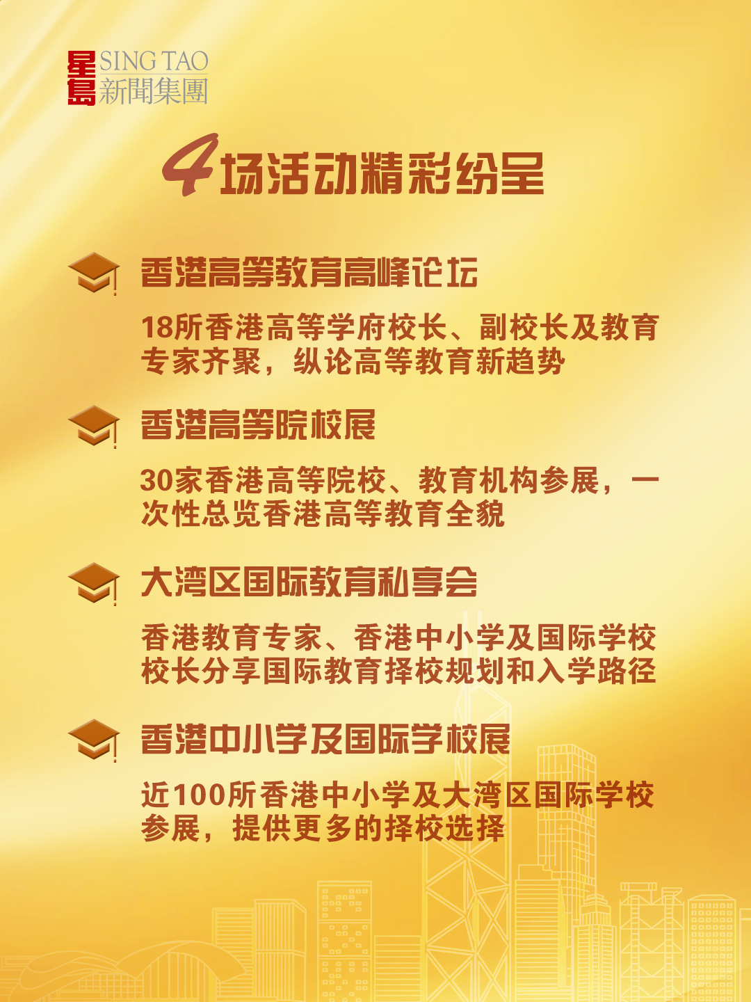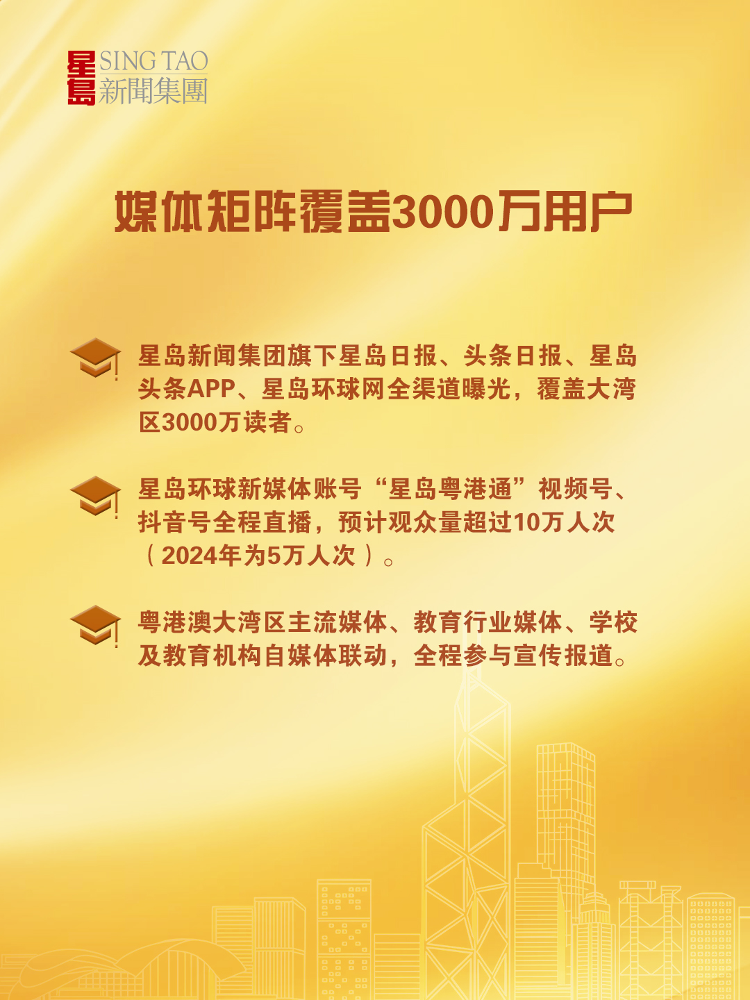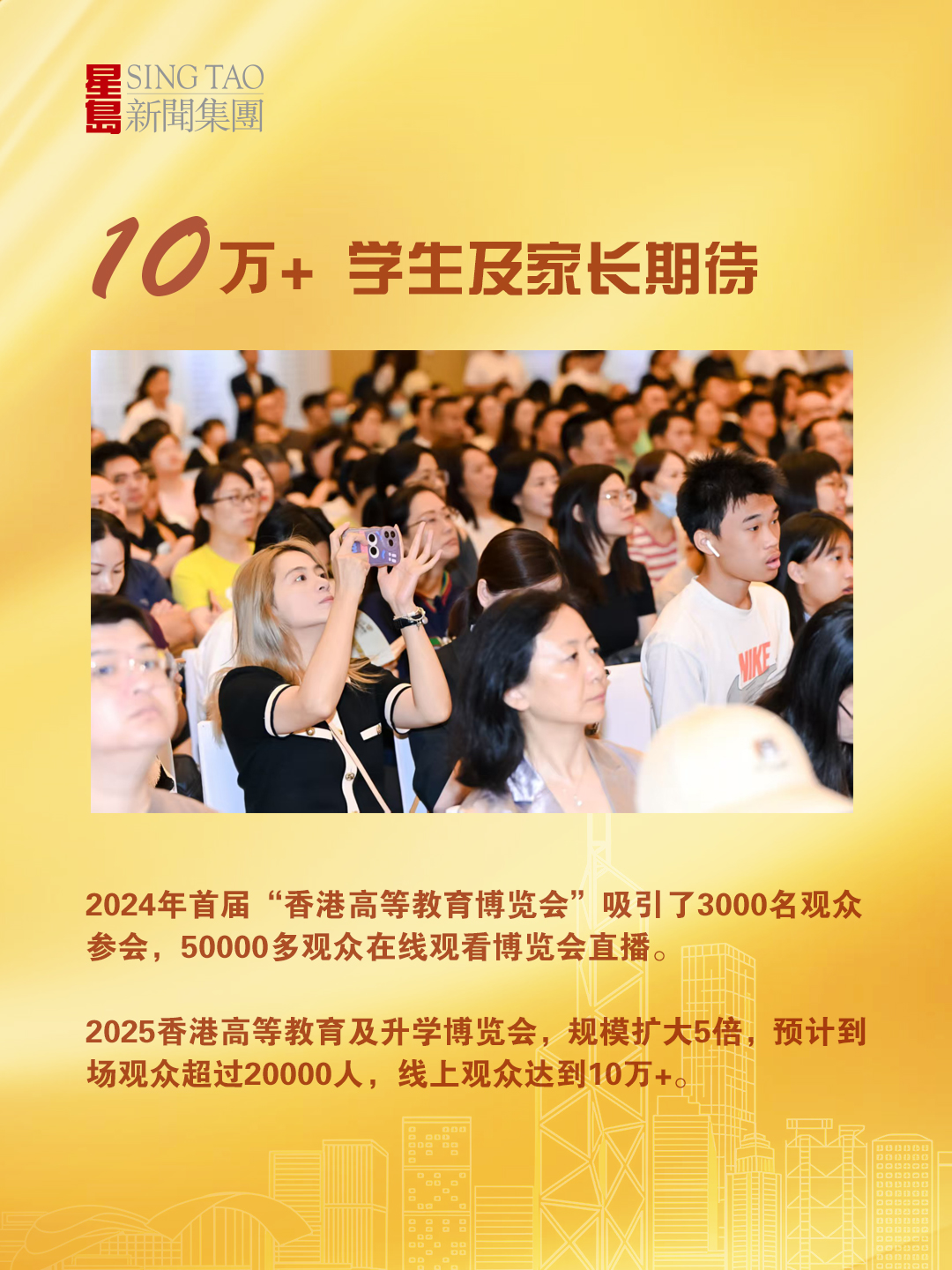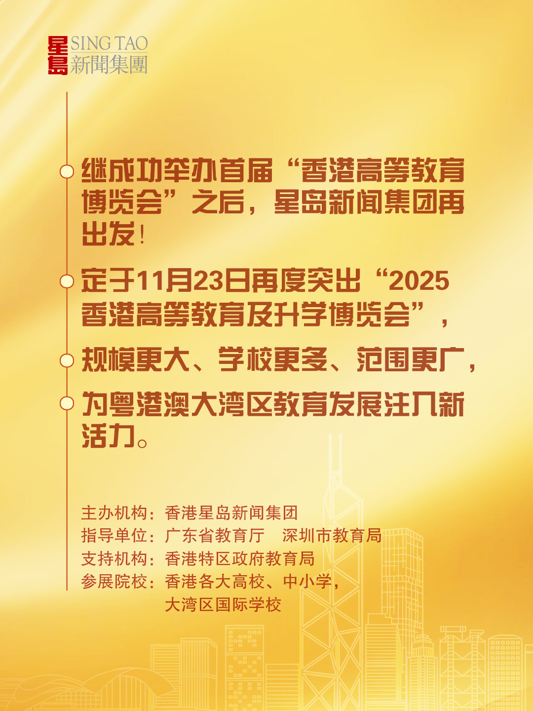 香港星岛新闻集团2024年在中联办、广东省教育厅、香港特区政府教育局、深圳市教育局的大力支持下,成功举办了“首届香港高等教育博览会”,吸引了近6万名学生和家长线下、线上热情参与,博览会赢得香港特首李家超的嘉许,以及粤港两地教育界的广泛好评。2025年,星岛再度发挥其媒体优势,回应社会各界殷切期盼,为粤港澳大湾区教育领域带来这场知识与机遇交融的盛宴。