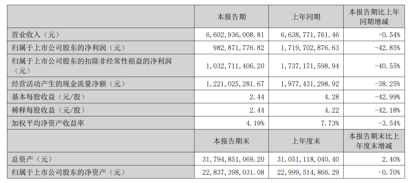 2025年上半年,长春高新营业收入为66.03亿元,同比减少0.54%;归属于上市公司股东的净利润为9.83亿元,同比减少42.85%;经营活动产生的现金流量净额12.21亿元,同比减少38.25%。