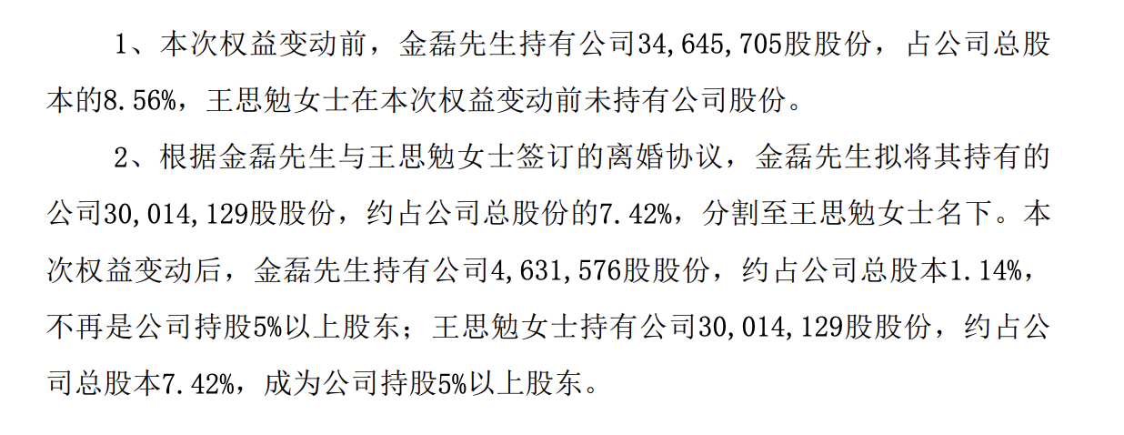 2024年1月,金磊与妻子王思勉协议离婚,根据离婚协议,金磊将其持有的长春高新约7.42%的股份分割给王思勉,前妻一跃成第二大股东,金磊持股比例降至1.14%。同时,两人签署了《一致行动人协议》,具有一致行动人关系。