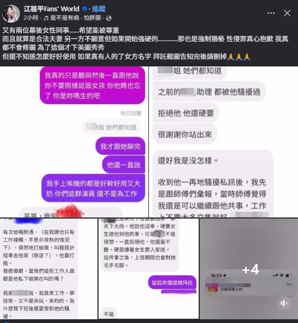 八点档女星江祖平日前抛下震撼弹,公开女性友人私讯控诉遭“电视台关系人士”性侵并偷拍的经历,还PO出好几张疑似性侵男的个资与正面清晰照,引发轩然大波,今(4日)凌晨时,江祖平于脸书公开好几张对话截图,内容都是电视台女性工作人员控诉遭同一名男子性骚的过程,其中包括该男传给女方的恶心言语。