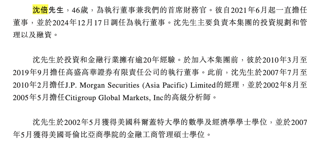 公开资料显示,沈倍,46岁,为执行董事兼公司首席财务官。其自2021年6月起一直担任董事,并于2024年12月17日调任为执行董事。沈倍主要负责集团的投资规划和管理以及融资。