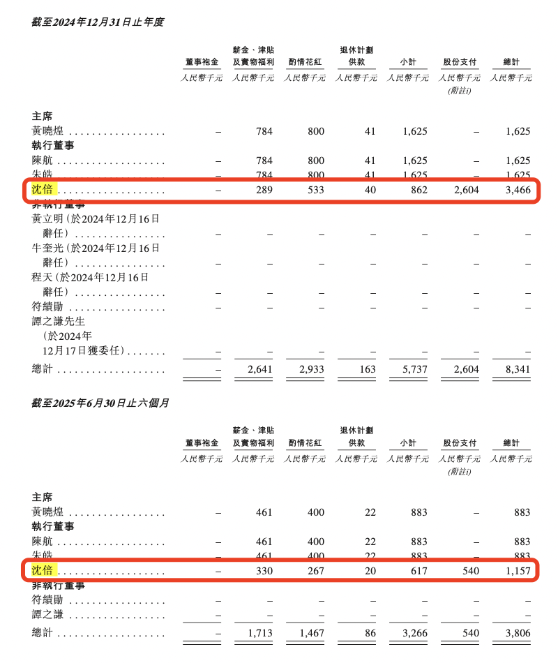薪酬方面,2022-2024年及2025年上半年,沈倍的薪酬总额分别为655.1万元、501.8万元、346.6万元及115.7万元,远超3名创始人同期薪酬;其中股份支付分别为601.2万元、406.3万元、260.4万元及54万元。
