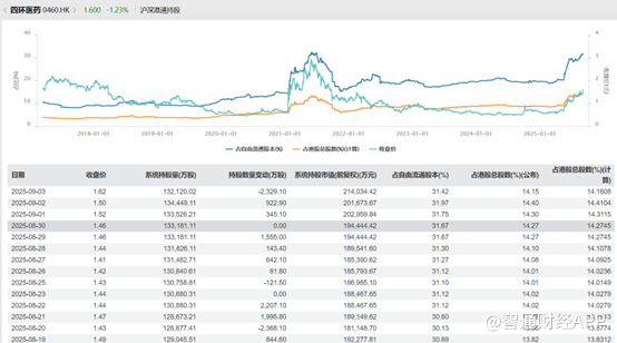 在这轮港股医药的"黄金抢筹期"中,四环医药(00460)亦被港股通大幅买入,港股通持有股份由年初的5.28亿股,占港股总股数比例的8.83%提升至9月3号的13.21亿股,占港股总股数比例的14.15%。