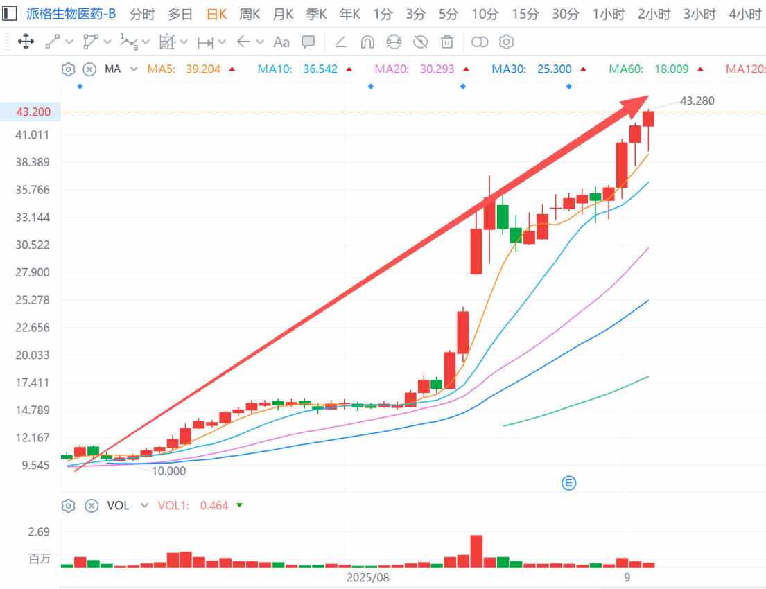 创新价值的持续释放让派格生物得到了二级市场的积极反馈。9月3日,公司盘中股价触及43.28港元,刷新上市新高,带动公司总市值跃过160亿港元。派格生物或有机会成为首家千亿市值的港股创新减肥药龙头。