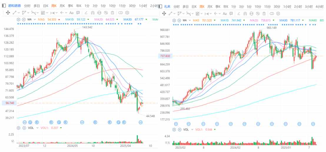 ▲周线走势图,左:诺和诺德,1809.94亿美元;右:礼来,6966.29亿美元