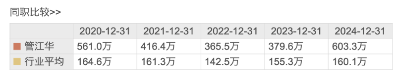 东方财富数据显示,2020年至2024年,管江华薪酬分别为561万元、416.4万元、365.5万元、379.6万元、603.3万元。
