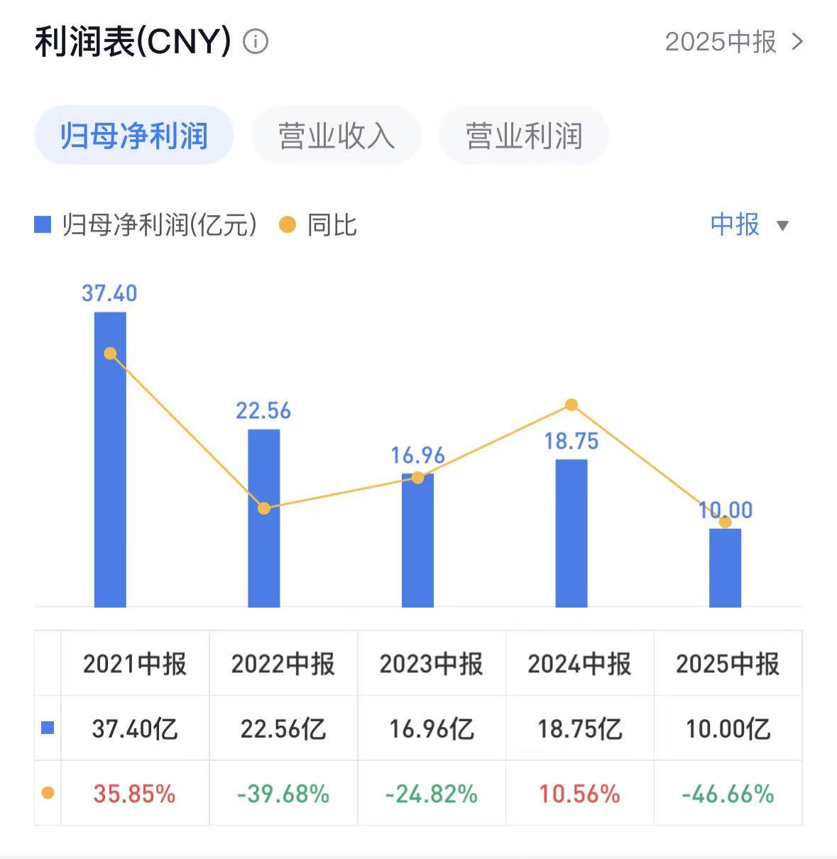 拉长时间线来看,2021年至2024年中期,中国飞鹤营收分别为115.44亿元、96.73亿元、97.35亿元、100.95亿元,增速分别为32.59%、-16.21%、0.65%、3.70%;归母净利润分别为37.4亿元、22.56亿元、16.96亿元、18.75亿元,增速分别为35.85%、-39.68%、-24.82%、10.56%。2025年上半年,中国飞鹤营收净利创近五年新低。