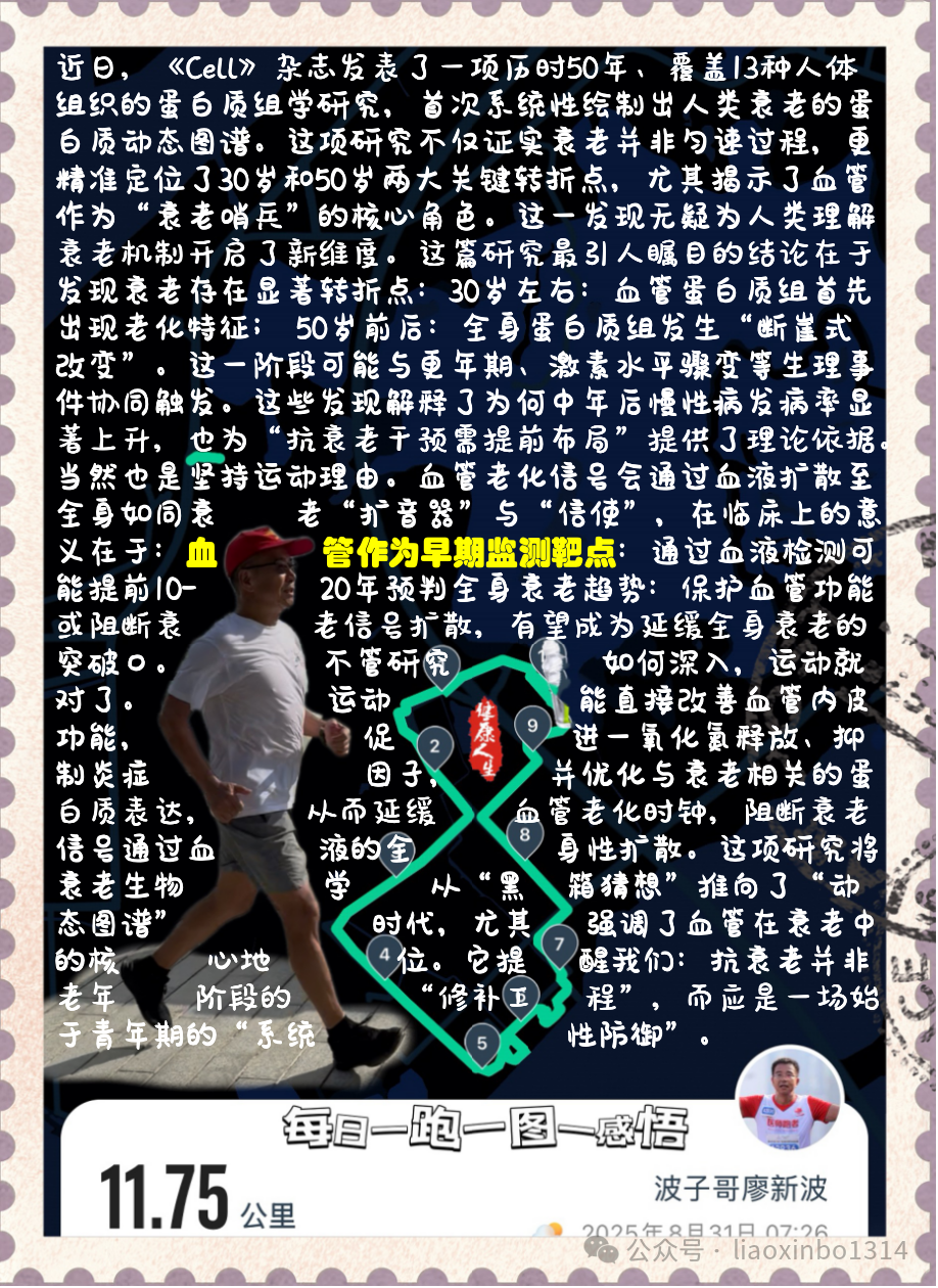 血管作为早期监测靶点:通过血液检测可能提前10-20年预判全身衰老趋势:保护血管功能或阻断衰老信号扩散,有望成为延缓全身衰老的突破口。不管研究如何深入,运动就对了。运动能直接改善血管内皮功能,促进一氧化氮释放、抑制炎症因子,并优化与衰老相关的蛋白质表达,从而延缓血管老化时钟,阻断衰老信号通过血液的全身性扩散。这项研究将衰老生物学从“黑箱猜想”推向了“动态图谱”时代,尤其强调了血管在衰老中的核心地位。它提醒我们:抗衰老并非老年阶段的“修补工程”,而应是一场始于青年期的“系统性防御”。或许不久的将来,“监测血管蛋白时钟”会成为健康管理的新常态,而人类延展健康寿命的梦想,正因这样的科学突破而照进现实。