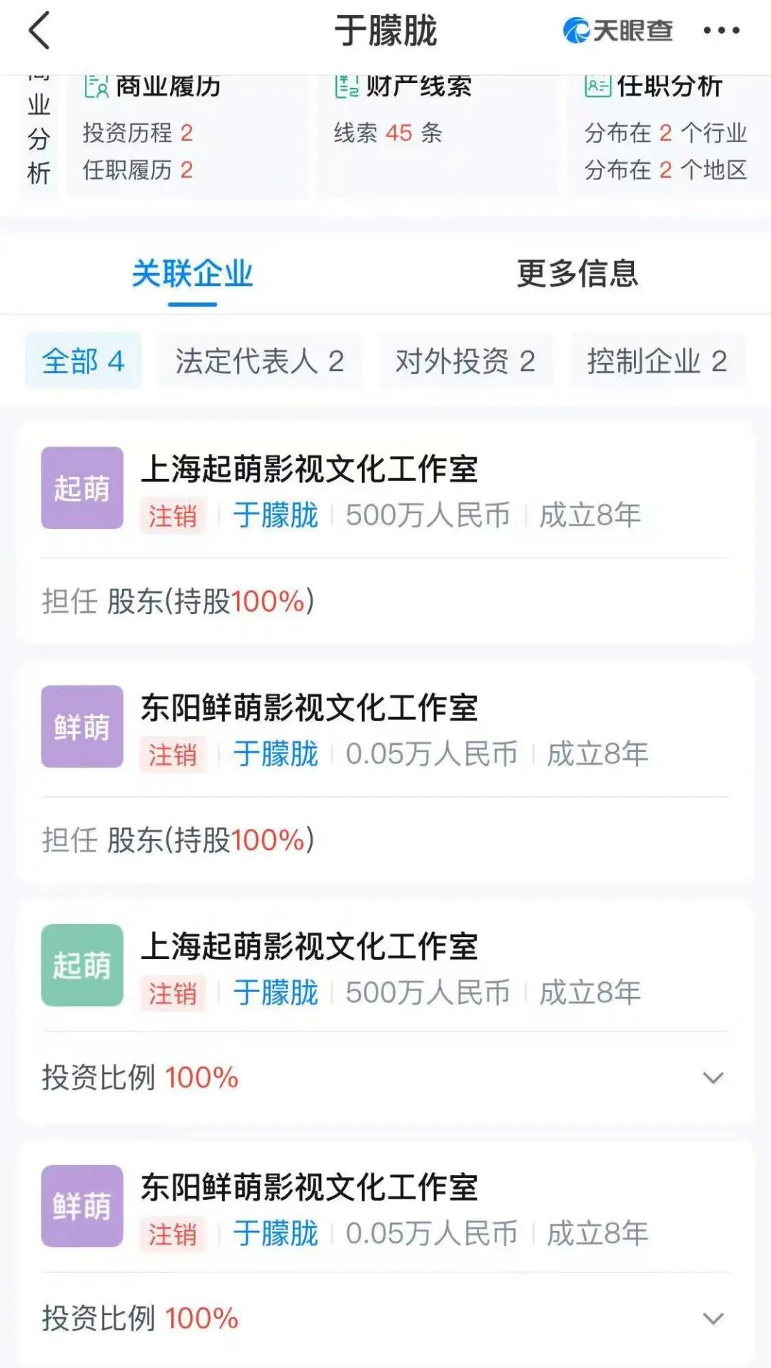 9月11日,演员于朦胧的名字突然冲上热搜。据天眼查显示,于朦胧名下所有持股公司均显示注销,时间分别在去年年底和今年7月。