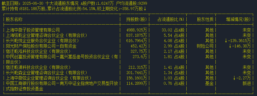 德必集团实际控制人为贾波,他直接持有6.4954万股。截至2025年6月30日,前十大流通股东中,有一家新进,为南方中证全指房地产交易型开放式指数证券投资基金,持有114.2899万股;三家减持,分别为长兴乾悦企业服务合伙企业(有限合伙)、阳光财产保险股份有限公司-自有资金、上海中微弦企业管理咨询合伙企业(有限合伙);有一家退出,为长兴乾重企业管理咨询合伙企业(有限合伙)。而上海中微子投资管理有限公司、上海弦乾企业管理咨询合伙企业(有限合伙)、长兴乾森企业管理咨询合伙企业(有限合伙)均由贾波控制。