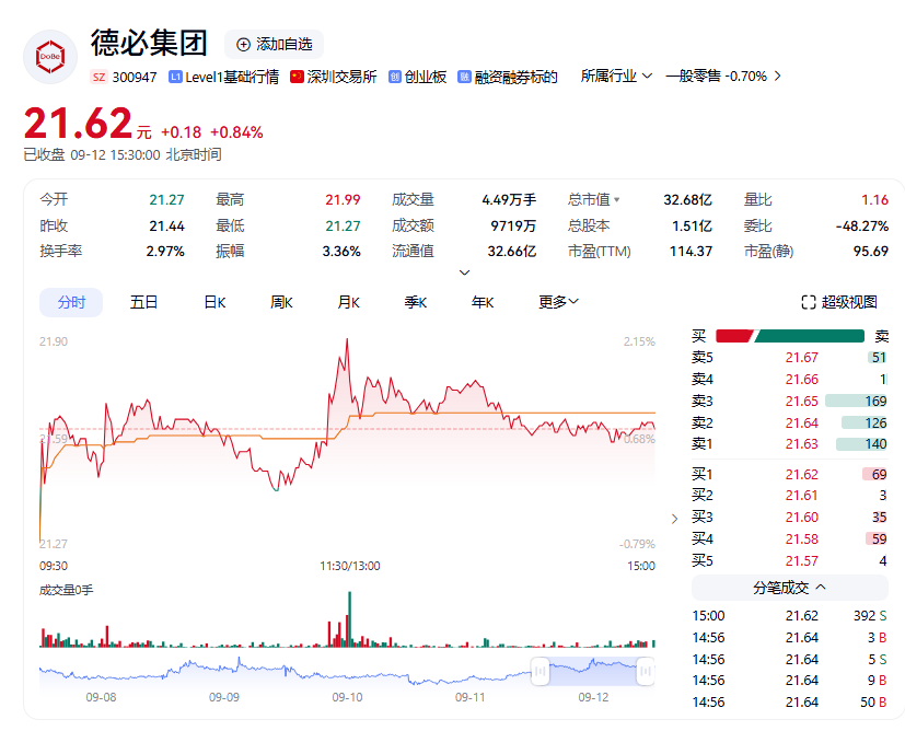 截至9月12日,德必集团收盘报21.62元,上涨0.84%,总市值达32.68亿元。